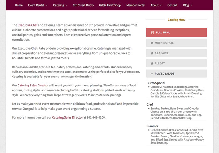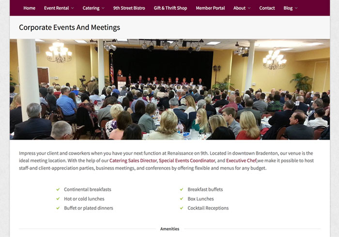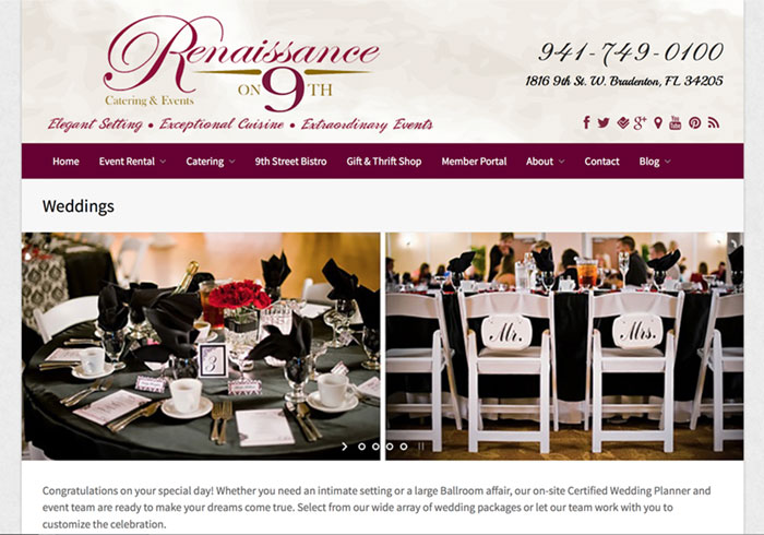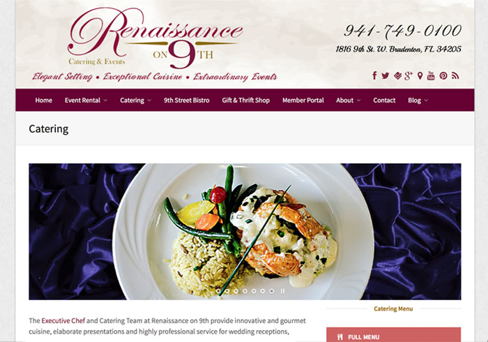 Situation: Meals on Wheels of Manatee needed to develop a modern responsive website to showcase it's catering hall called Renaissance on 9th. The new site needed to showcase the venue, catering, food and event accommodations to drive more business and revenue.